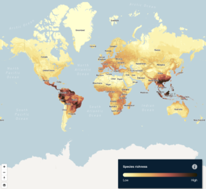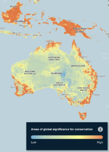 Nature Map Explorer contains 12 global maps displaying aspects of biodiversity and ecosystems, for instance Terrestrial Habitat Types, Human Impact on Forests, Threatened Species Richness and Areas of Global Significance for Conservation. The maps have been developed to support the design and planning of policies to limit biodiversity loss and greenhouse gas emissions from land use. The developers are seeking feedback from users to refine the maps and their usefulness. To whet your appetite, the two examples below show the Species Richness across the world and Areas of Significance for Conservation in Australia and our northern neighbours.