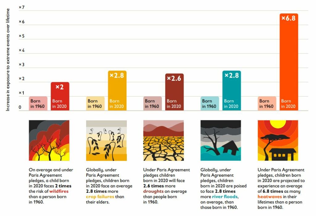 The figure above compares the projected lifetime exposure to extreme weather events of children born in 1960 and 2020, assuming that nations implement their Paris agreement pledges to reduce greenhouse gas emissions. Moving left to right the events are wildfires, crop failures, droughts, river floods and heatwaves. The same modelling demonstrates that limiting global warming to 1.5oC (about half the warming that the current Paris pledges will produce) will reduce the risks by between 10 per cent (for wildfires) and 45 per cent (for heatwaves).