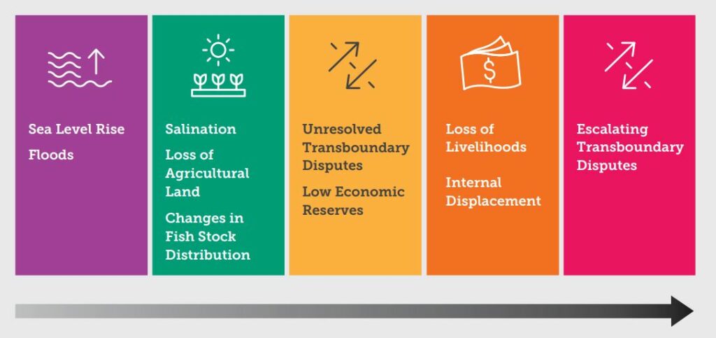 I particularly like the photos and figures in the report, for instance the figures below displaying how climate change initiated risks cascade through to transboundary disputes between nations …