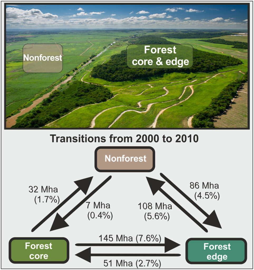 The figure above demonstrates the conversions between non-forest, forest core and forest edge (within 100 metres) in the tropics between 2000 and 2010. There was some afforestation and reforestation as well as deforestation but the net result was a loss of 119 million hectares (MHa) of forest core, an increase of 72MHa of forest edge and an increase of 47MHa of non-forest. The amount of forest core actually destroyed (145 + 32 = 177MHa) is a bit bigger than Queensland.