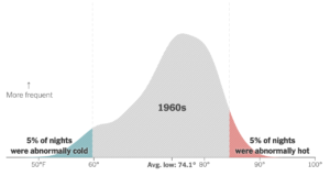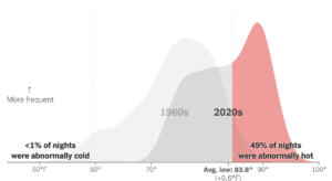 I think it’s widely known that the main danger to human health during heatwaves is not the high maximum temperature during the day but the high minimum temperature during the night. It’s very important for the body to have a chance to cool down. The dangers of global warming are nicely illustrated in the two graphs below which display the minimum night-time temperatures (oF) in summer in Phoenix, Arizona in the 1960s and (so far) in the 2020s. The most common minimum in the ‘60s was 74.1oF but by the early ‘20s this has increased by almost 10 degrees to 83.8oF. In the ‘60s 5 per cent of night-time minimums were abnormally hot but five decades later half of all nights were abnormally hot. (Nights are considered abnormally cold or hot based on the 5th and 95th percentiles of the 1960s temperature distribution.) In the hyperlink these two graphs are the beginning and end of an animation that nicely displays the change between the 1960s and the 2020s.