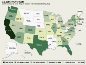 Sales of all-electric vehicles (EVs) are booming in the USA. Approximately 400,000 will be sold this year, 2.6 per cent of all new light duty car and truck sales (c.f., 1.6 per cent in 2020). Tesla rules the roost, capturing 70 per cent of the market. The geographic distribution is also extremely skewed. Of all light duty EVs on the road in 2020, 42 per cent were in California. The next five states on the list made up barely half of California’s total. The boom is expected to keep booming but Tesla will not continue to have all its own way as more manufacturers enter the market.