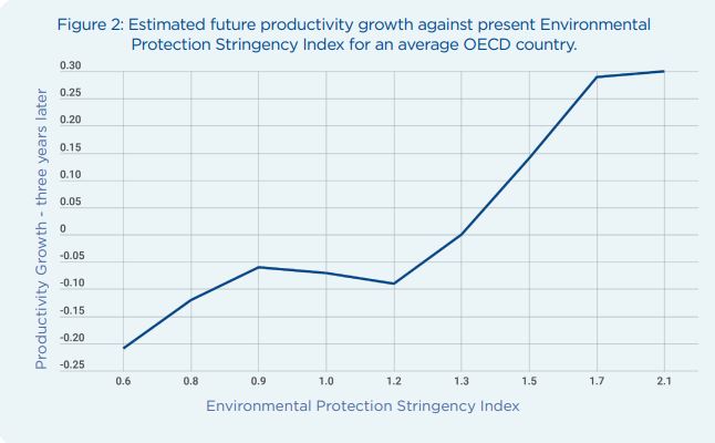 While environmental regulations can increase the cost of production initially — for example, a carbon tax makes coal more expensive, which increases the costs of metal production — our results show that adopting tighter environmental policies has a positive impact on a country’s overall future productivity growth.