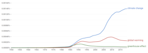 The October 2021 list of new words for the Oxford English Dictionary (no home is complete without a copy of at least the Shorter OED in my view) has embraced climate change and sustainability. There are ten completely new words (e.g. degrowth and natural capital), 38 new compound words (e.g. climate denial and net zero as sub-entries to climate and net respectively), and 13 new senses to existing entries (e.g. windmill: “A wind turbine used to generate electricity”). But the OED isn’t just about what words mean, it’s also a history book and a monitor of social and lexicological trends - the blog and ‘new word notes’ within the hyperlink provide some interesting titbits. If you’re a teacher, or a home schooling parent, there are even teaching resources. The graph below shows the usage in English language publications of “climate change”, “global warming” and “greenhouse effect” from 1950 to 2018. None of the three had much currency before 1980 and for the next few years their usage increased together but from 1990 they have pursued their own trajectories. (This is an Ngram if you haven’t seen one before.)