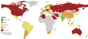 No country was accorded the ‘Very High’ status category on the overall CCPI. The top ranking country was Denmark with a score of 77, closely followed in the 70s by Sweden, Norway, UK and Morocco, and then Chile and India marginally below 70. So you don’t have to be rich or northern European to perform well.