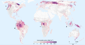 - The areas with the most irrecoverable carbon are mostly in two bands: the tropics and the far north. The principal locations are the tropical forests of the Amazon, Congo and SE Asia (53 Gt); peatlands of Canada and Siberia (12 Gt); temperate rainforests of NW North America (5 Gt); and global mangroves and tidal wetlands (5 Gt). The largest single location by far is the Amazon (32 Gt).