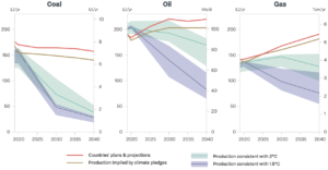 There can be no surprise at all that the UK is just one of many countries whose actual emissions reduction plans don’t match their rhetorical promises and legal obligations; a point driven home by countries’ projections for the production of fossil fuels over the next 20 years. The three graphs below show countries’ plans and projections for the production of coal, oil and gas between 2020 and 2040. Two things stand out. First, for coal, oil and gas, countries’ plans and projections for production are significantly higher than the production amounts implied by their climate pledges. Second, and more importantly, although there’s a marginal reduction projected for coal, sizeable production increases are planned for oil and gas. For none of the three do countries’ production plans (or even their climate pledges) come close to what would be required to keep global warming under 2C, let alone 1.5C.