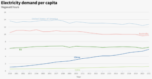 The first graph below shows the electricity demand per person for the EU, USA, China, India and Australia from 2000 to 2021. The big mover is China, increasing from around 1 Megawatt hour per person in 2000 to almost 6 in 2021, about the same as the EU. Australia has dropped by about 10 per cent from a peak of around 11 Megawatt hours per person in 2004 to just under 10 in 2021.
