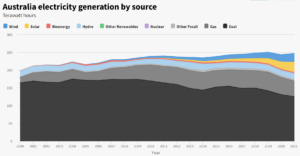 Next, the sources of Australia’s electricity from 2000 to 2021. The important point to note here is that while the combined wind and solar production has increased ten-fold from 5.5 Terrawatt hours in 2010 to 54 in 2021, the combined production from fossil fuels has changed little, going from 181 Terrawatt hours in 2000 to 174 in 2021, peaking at 217 in 2010. Hydro and bioenergy have also changed little over the period. In short, wind and solar have not replaced fossil fuels, they have supplemented them as demand for electricity has increased from 200 Terrawatt hours in 2000 to 250 in 2021.