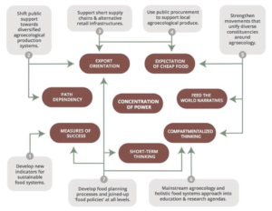 In the last 5-6 minutes, Wallace briefly describes agroecology, a radically different way of farming involving, for instance, intercropping, crop rotation, cover cropping, conservation tillage, trap crops, forest farming, silvopasture, wildlife corridors, riparian buffers, and integrated crop-livestock systems. These changes would transform a system consisting of multinational companies that control farming and farmers to maximise the production of crops, meat, dairy and profits, all for export, into one that generates integrated regional food landscapes tended by and producing nutrition and welfare for local communities.