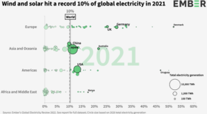 In 2021 wind (6.7 per cent) and solar (3.4 per cent) generated 10 per cent of global electricity for the first time. In 2000 it was 0.2 per cent (all wind) and in 2010 it was 1.7 percent (95 per cent wind). This is encouragingly rapid growth over the last decade (blue wedges in bottom right corner in graph below), but 10 per cent is still only 10 per cent!