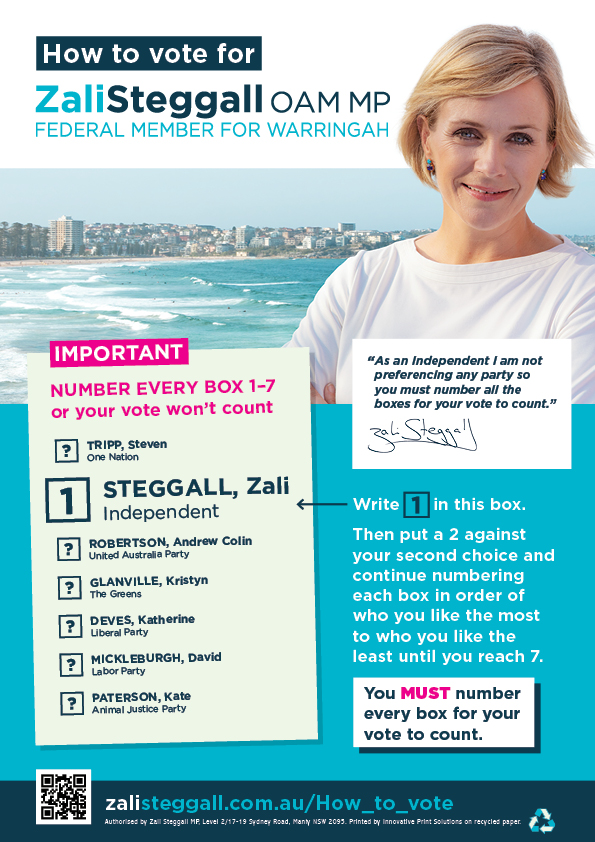 Only slightly less risky are the How-to-Vote cards [pictured below] of independents such as Zali Steggall, in Warringah, and Kylea Tink in North Sydney. They, at least, identify their opponents (and in these examples, their opponents’ party affiliation) but put a question mark, where a number needs to be placed, on the actual ballot paper.