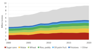- Global production of crops increased by 50% between 2000 and 2017 but has changed little since then. The major crop types are sugar cane (20%), maize (12%), rice and wheat (8% each), and palm oil and potatoes (4% each).