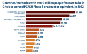 Ten countries are forecast to have over 3 million people in food Crisis or worse in 2022. The most afflicted countries are in a crescent extending from West Africa through Central and East Africa and Yemen to Pakistan and Afghanistan. A history of European colonisation also seems to be a pretty common factor.