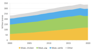 - Meat followed a similar growth pattern but at a 25th of the quantities. Chicken (35%), pig (33%) and cattle (20%) accounted for 90% of global meat production.
