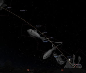 The (almost) real-life picture above from Museums Victoria shows the view in Australia. The one below is stylised and from the northern hemisphere (and so the line of the planets is reversed, so to speak, running to the south-east rather than the north-east) but it provides a clearer idea of what to look for.