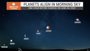 My weekly contributions usually focus on our Earthly environment but I must draw your attention to a bigger picture. During June there’s a great opportunity to see five planets in the pre-dawn sky – well, six if you include our own. Looking towards the north-east and north at about 5.15-6.15am (east coast time) on clear mornings recently I’ve been lucky enough to identify our closest neighbours in the solar system, Mercury, Venus, Mars, Jupiter and Saturn in (a slightly arcing) alignment above the horizon (see the diagram above). It’s remarkable enough to be able to see them all at once like this but even more remarkable that they are in the same order as their distance from the sun, Mercury being 56 million kilometres from the sun and Saturn 1.4 billion. It’s taken light about two and a half hours to go from the sun to Saturn and back to my retina. But this is just the final lap of the light particle’s very long journey as it may have taken thousands or even millions of years to get out of the sun in the first place.