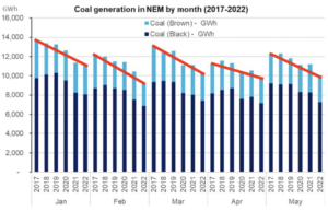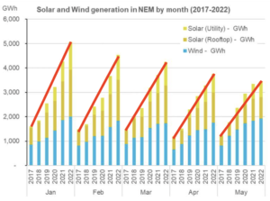 The next graph shows the opposite trends for solar and wind generated electricity. Of course, more electricity is still generated from coal (mostly 10-13,000 GWh per month) than wind and solar (mostly 1.5-4,000 GWh per month) but the ratio is changing. In January 2017 coal generated roughly nine times as much electricity as wind and solar but in 2022 it was just over twice as much.