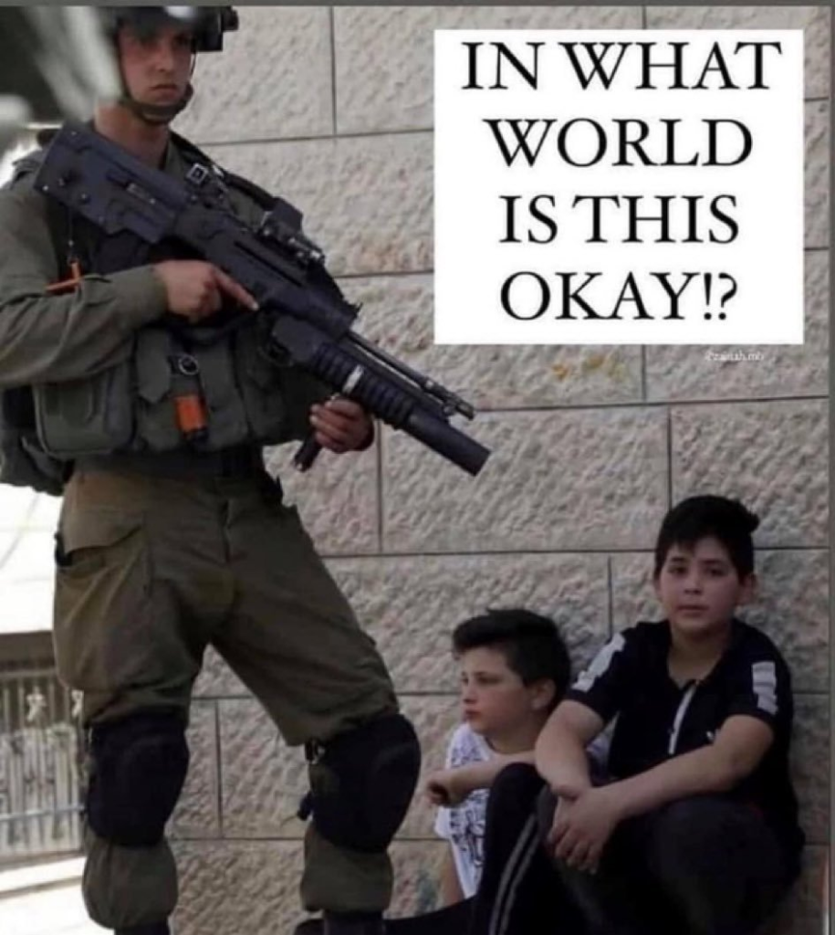 In what world is this okay? Israeli soldiers hold guns to young Palestinian children. This is never okay.