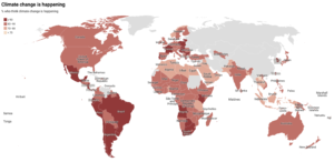 The vast majority of people in 81 surveyed countries think that climate change is happening. Only in Haiti and Laos (both 67%) were less than 70% of this view.