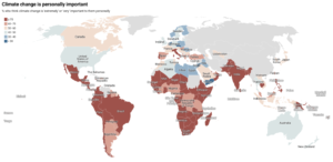 While majorities of people in most countries worry about the risks associated with climate change, people seem to think that the risks are far greater for their country as a whole and for future generations than for themselves. And somewhat puzzlingly, people in South America and Africa express low concerns about the risks of climate change to themselves but think it is ‘extremely’ or ‘very’ important to them personally.