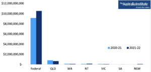 In 2021-22 Australian Federal and state governments provided $11.6 billion dollars of subsidies to fossil fuel industries in the form of spending (for instance on infrastructure such as ports, railways, pipelines and power stations) and tax breaks. This was a 12% increase on the previous year. The vast majority ($9.4 billion) was in the form of Federal tax concessions, of which the largest was the Fuel Tax Credits Scheme, a whopping $8 billion and projected to increase to $9.9 billion in 2024/25.