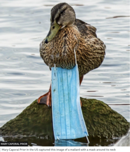 It’s tempting to make a joke about it – ‘ new species of Mallard discovered’ – but this is no laughing matter. Birds all over the world are living amongst plastic, occasionally using it productively, but mostly suffering and dying as a result of its countless forms invading their environment. Nearly a quarter of the photographs submitted to Birds and Debris, an online project collecting photographs of birds and rubbish, show birds and, you guessed it … disposable face masks. There may be an element of selection bias occurring here – photographers being especially attracted to snapping and submitting examples of this relatively novel pollutant – but you’d need to be blind not to be aware of the now ubiquitous nature of intentionally or accidentally discarded masks. Warning, many of the pictures on the links are rather more challenging than the one above.