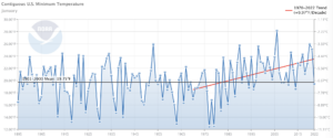 If you’d like to play around with more weather data for the USA, head over to the NOAA website. For instance, and to illustrate further the point about more warming occurring when it’s cooler, the average maximum July temperatures shows a lesser increase of 0.35oC per decade, and the average January minimum (graph below) shows an increase of 0.97oC per decade.