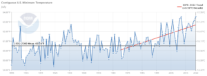 The nocturnal change is well illustrated in the graph below of daily minimum temperatures averaged across July in the contiguous 48 states of the USA between 1895 and 2022. In the 53 years from 1970 to 2022, only 11 have been below the 127-year average. The red line in the graph demonstrates the overall trend for the last 53 years - an increase of 0.5oC per decade.