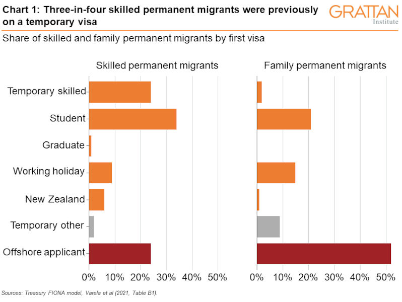 In the short term, more permanent migrants would not mean more people in Australia. Why not? Because most people who receive a permanent visa are already in Australia on a temporary visa (see Chart 1). Increasing the number of permanent visas simply means that some temporary visa holders already in Australia never have to leave – although offering more permanent visas may also attract more migrants to Australia on temporary visas.