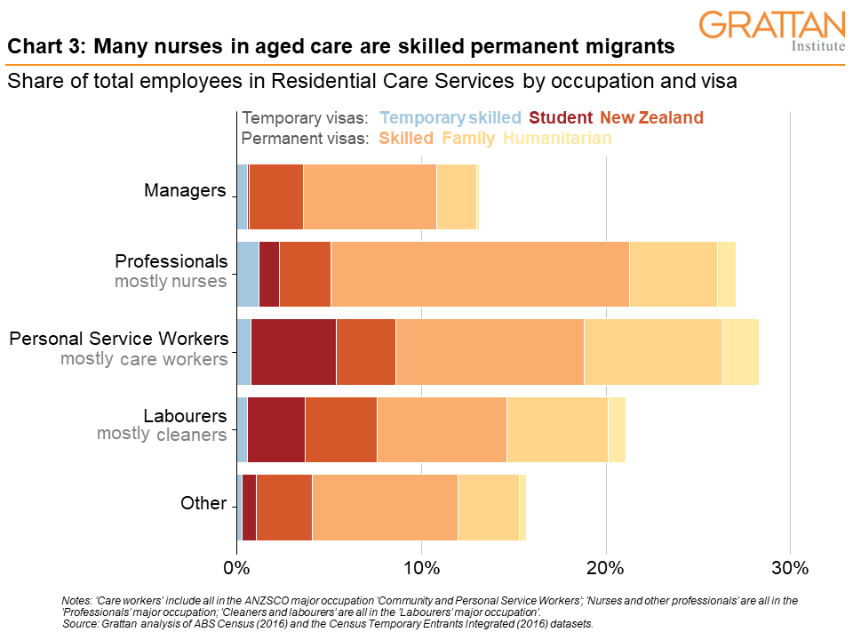 A targeted increase in the permanent migrant intake might be able to fill skill gaps in specific industries. For example, Australia already recruits many aged-care nurses as skilled permanent migrants, who make up roughly 15 per cent of the workforce (see Chart 3).