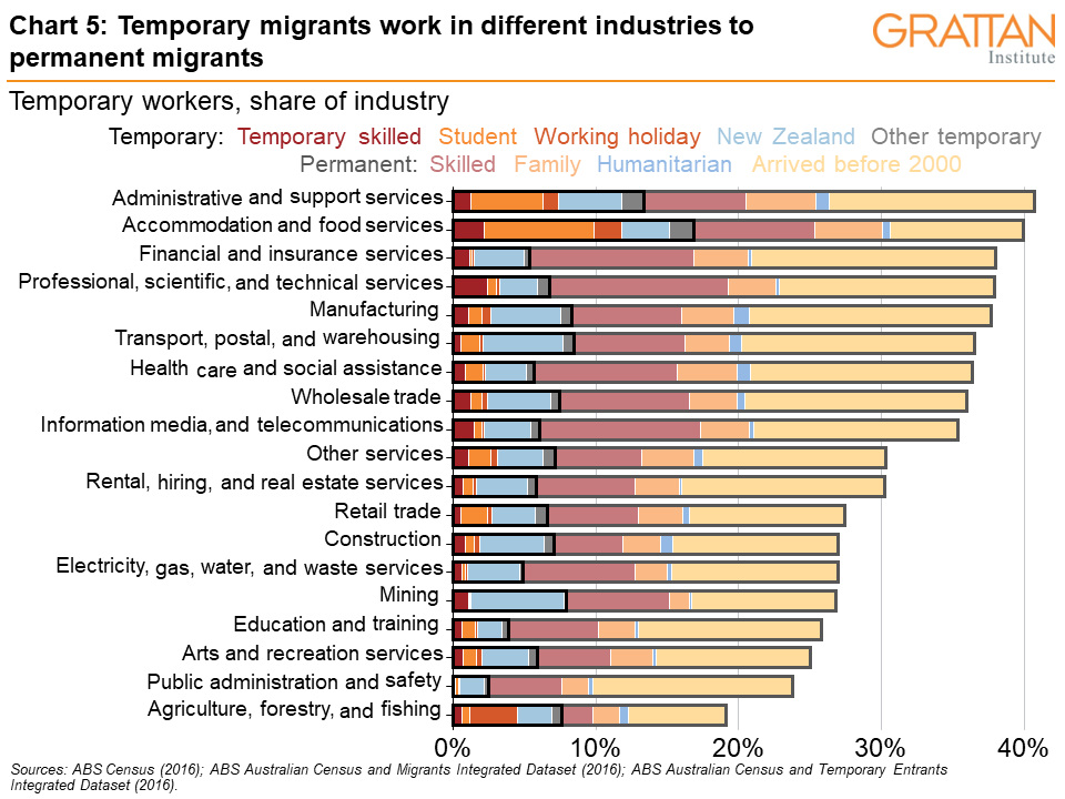The number of student and working holiday visa-holders plummeted when our borders were shut because of COVID in 2020 and 2021, and those numbers have yet to recover (see Chart 4). These visa-holders work in some of the industries suffering the worst labour shortages, such as food and accommodation services. But permanent migrants generally don’t work in hospitality and tourism, where wages are low; instead, they tend to work in high-wage industries such as professional services and finance (see Chart 5).