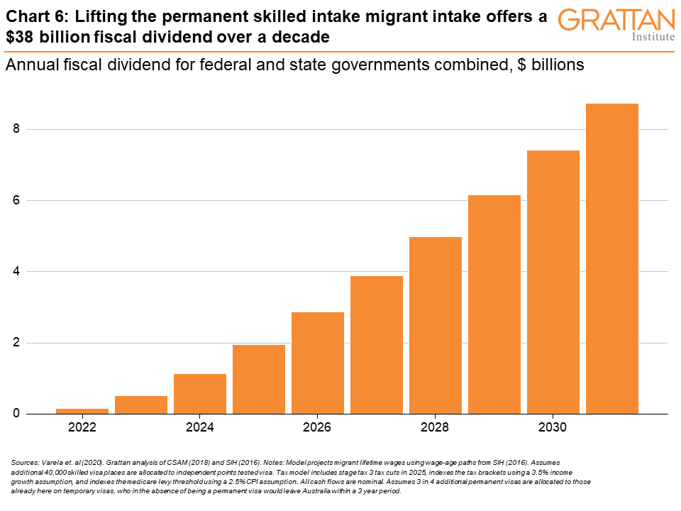 Grattan Institute modelling suggests that increasing the size of the permanent intake from 160,000 to 200,000, and allocating those extra visas to skilled workers, could offer a $38 billion boost to federal and state governments combined over the next decade (see Chart 6).