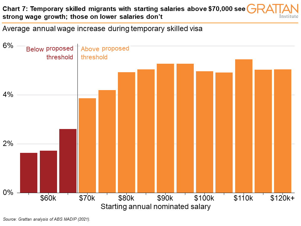 Exclusively targeting high-wage jobs for temporary sponsorship would mean less red tape for sponsoring employers, especially since high-wage workers are at much less risk of being exploited. Our research shows that sponsored workers earning less than $70,000 a year tend not to get wage rises once in Australia – reflecting their lack of bargaining power – whereas higher-wage temporary migrants do (see Chart 7).