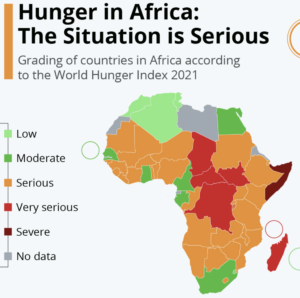 Across Africa 278 million people suffer from chronic hunger. This is 20% of the population; globally the figure is 10%. The main drivers of hunger in 2021 were war, climate change and Covid.