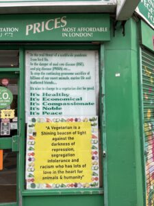 An Indian vegetarian restaurant in Angel, London extolling the health and environmental benefits of vegetarian food (this restaurant was very generously offering free food and drink all day to all-comers on the day of the Queen’s funeral);