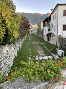 And a dried-up river bed in Cison di Valmarino on the edge of the Dolomites in northern Italy. The high boundary walls are indicative that the river can be a raging torrent.