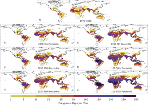 The global projections for ‘Dangerous’ days per year for both years are summarised in the maps below. (If you wish to view these in detail, I suggest that you look at and expand Figure 3 in the link to the original article.)