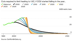 How could anyone looking at the graph above avoid the conclusion that we won’t keep warming under 1.5oC? Technically we still can, we simply won’t. That doesn’t mean that we should give up, just that the sooner we do start reducing emissions, the lower the eventual warming will be and every tenth of a degree matters … if not to us, to subsequent generations.