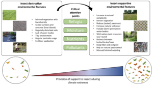 Local environmental characteristics can either harm or benefit insects, particularly during climate extremes. There is, however, much that local authorities, communities, farmers, land managers and householders can do to support insects. The figure below suggests ways of changing local environments, particularly in cities which are very insect-unfriendly, to remove or reduce ‘insect-destructive’ features and create ‘insect-supportive’ ones. The focus is on reducing ways in which natural environments have been simplified by intensive sculpting and rigid management and, instead, creating diversity and allowing a bit of wildness and disorder to develop.