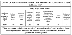 This analysis of daily Rural Reports was conducted for six weeks prior to the recent Federal election and for three weeks afterwards. The Rural Reports are fifteen-minute radio programs aired at 6.15am weekdays on ABC radio in regional Australia from the Pilbara to Gippsland and from Esperance to Townsville and beyond.