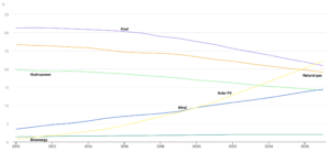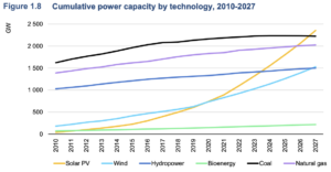 By 2027 solar pv will be the main source of the world’s electricity (22%). Wind, hydro and solar combined will supply 50%.