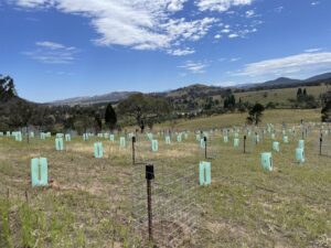 The picture below is a hillside at Scottsdale, a Bush Heritage conservation property on the banks of the Murrumbidgee (just visible in the centre) near Bredbo, NSW. The guards are protecting a range of trees, plants and grasses – drooping she-oak, black cypress pine, broad-leaved peppermint, hickory wattle, blue tussock grass and more – planted last weekend to restore habitat and food sources for Glossy Black and Gang-Gang cockatoos.