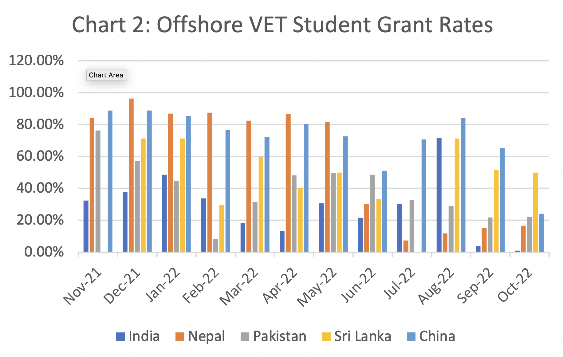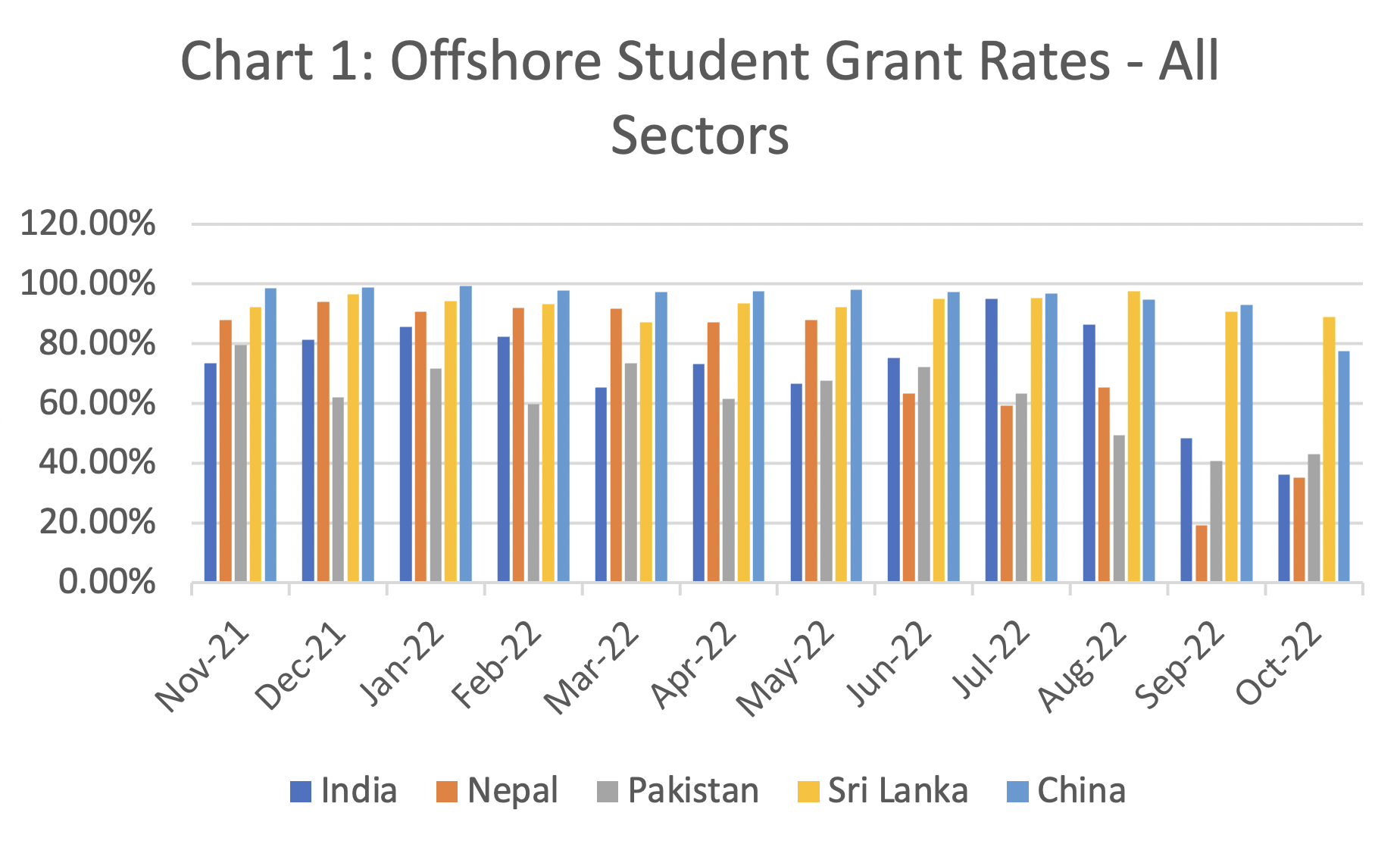 For major source nations of India and Nepal, the decline in grant rates were most severe falling to 36.3 percent for India and 35.2 percent for Nepal in October 2022 (see Chart 1).