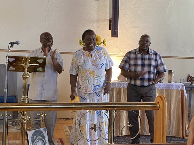 Here they are leading a song of praise. Dr Ronald on the left and Rev’d Agatha have just received Permanent Residency. We were celebrating this and the fact that, during the long wait for this clarity of belonging, Ronald had completed a PhD in International Economics and Rev’d Agatha had completed training so as to be ordained as an Anglican priest. Permanent Residency also means they can now safely make a visit back to other family members who are still in Uganda. Jude, on the right, is still in the middle of that pursuit of visa permanency and continues to endure a long separation from loved ones.