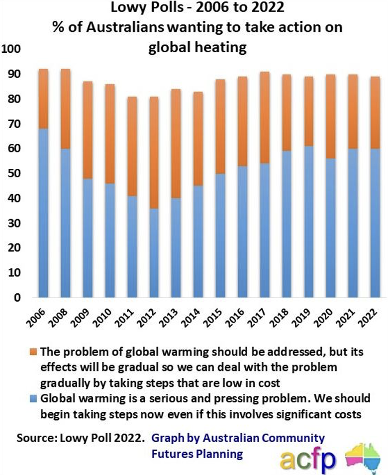 It is a matter of record in Lowy Institute polls that in the 16 years between 2006 and 2022 the proportion of Australians who wanted the government to do something to prevent climate change never dropped below 80%. As early as 2006, over 90% wanted the issue to be addressed, with approximately 70% of that group wanting something done immediately “even if this involves significant costs”. So while the people of Australia at the start of the 21st century had the foresight to see that it would be in their interest to begin taking steps to stop climate change sooner rather than later “even if this involves significant costs”, or at least consider taking steps “that are low in cost”, successive federal governments failed to establish a plan to prevent or mitigate climate change and conservative governments in particular used any argument they could, no matter how unfounded, to kill off every chance of the Australian people to rise to the challenge of climate change and protect their economic interests and their children’s future. In the last year both major political parties – Labor and Liberal/National – have also done their best to kill off Australia’s independence in sovereignty and our safety from war.