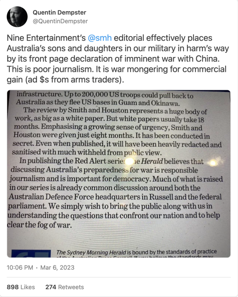 In the latest instance of the Australian media’s deluge of propaganda geared toward manufacturing consent for war with China, Nine Entertainment-owned newspapers The Sydney Morning Herald and The Age have brought together a panel of “experts” to assess how well-prepared Australia is for a hot war with its primary trading partner. The question of if that war is necessary or should be prepared for is left completely unexamined.