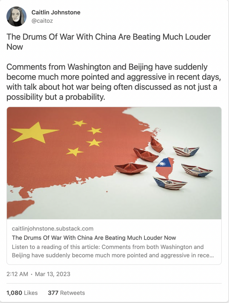 This completely intolerable situation is why Australians are being aggressively hammered with war propaganda about China right now; if we were simply allowed to consume truthful information and think normal thoughts, no healthy person would ever consent to any of this.
