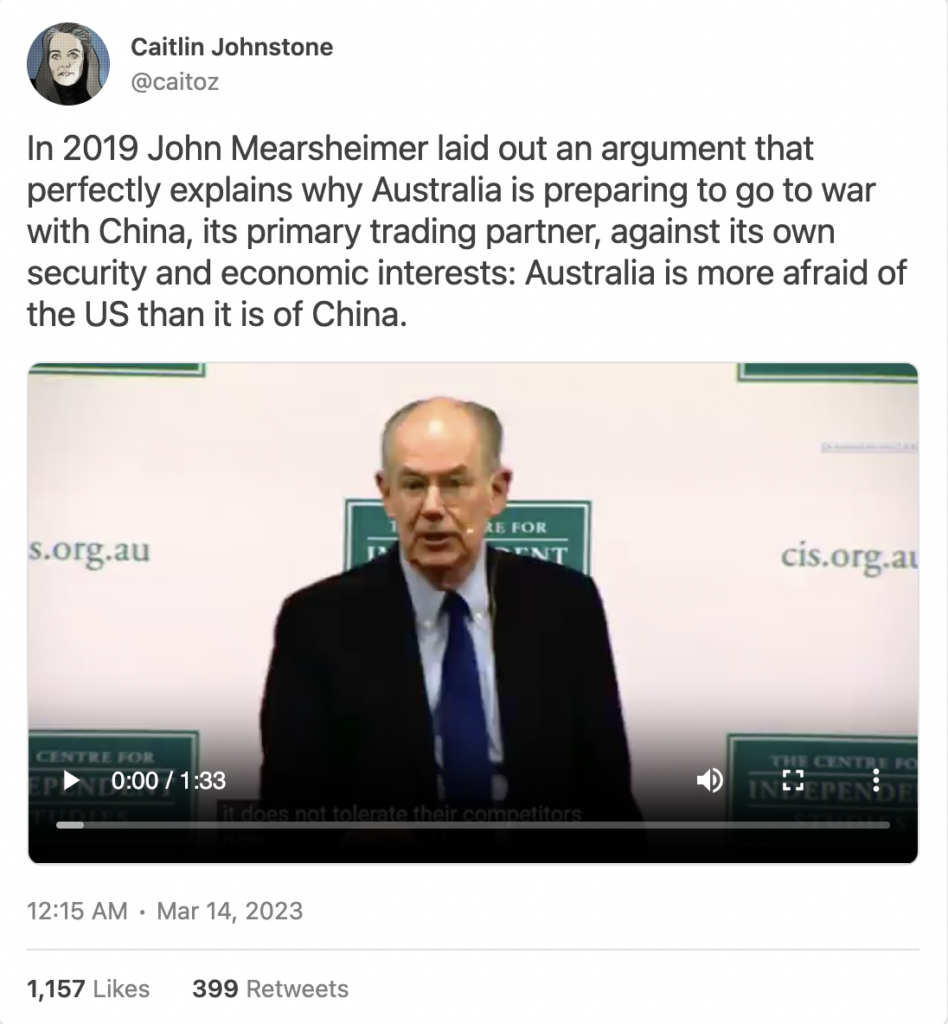 Nobody ever talks about this, even though anyone who studies US foreign policy knows it’s true. All the Australian propagandists always make up stories about what China might do to us if we don’t play along with Washington's brinkmanship against Beijing but they never talk about what the US would do to us if we don’t. This is because they don’t want us thinking too hard about the fact that we are being coerced by the world’s most powerful government into preparing to fight a war of unfathomable horror under the tacit threat of inflicting even worse horrors upon us if we don’t.