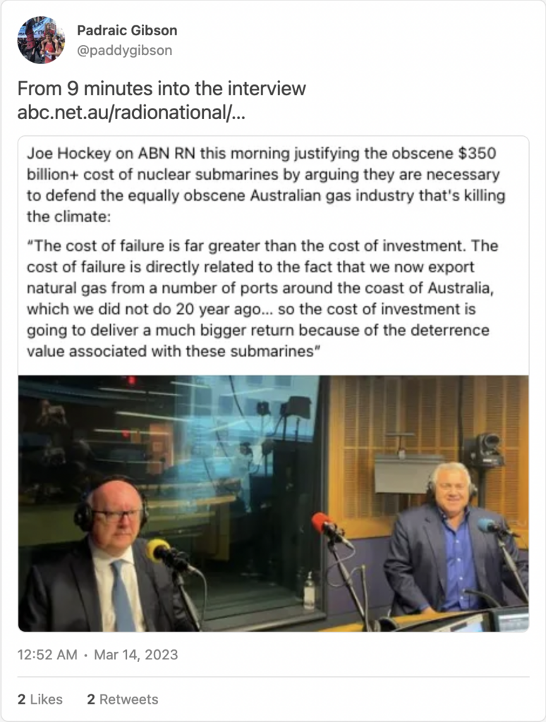 As part of Australian media’s relentless onslaught of war- with- China propaganda, the government-run Australian Broadcasting Corporation just aired a radio segment on RN Breakfast about the newly revealed details on the AUKUS nuclear-powered submarine deal, featuring two guests who are enthusiastic supporters of the deal, and hosted by another enthusiastic supporter of the deal.